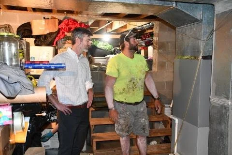 Alek Stonerock shows USDA Rural Development in Ohio State Director Jonathan McCracken the new furnace and duct work installed in Janie's basement. USDA Photo.